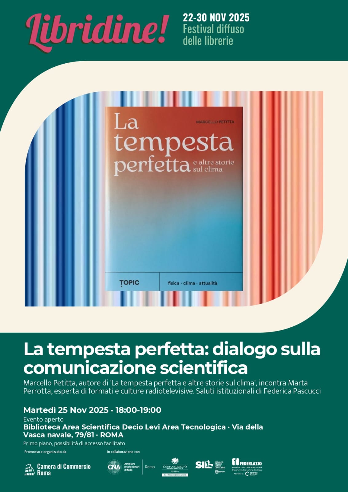Marta Perrotta, esperta di formati e culture radiotelevisive e Direttrice di Roma Tre Radio, dialogherà sul cambiamento climatico e come raccontarlo con Marcello Petitta, fisico del clima, e autore del libro La tempesta perfetta e altre storie sul clima, Topic, 2025.
